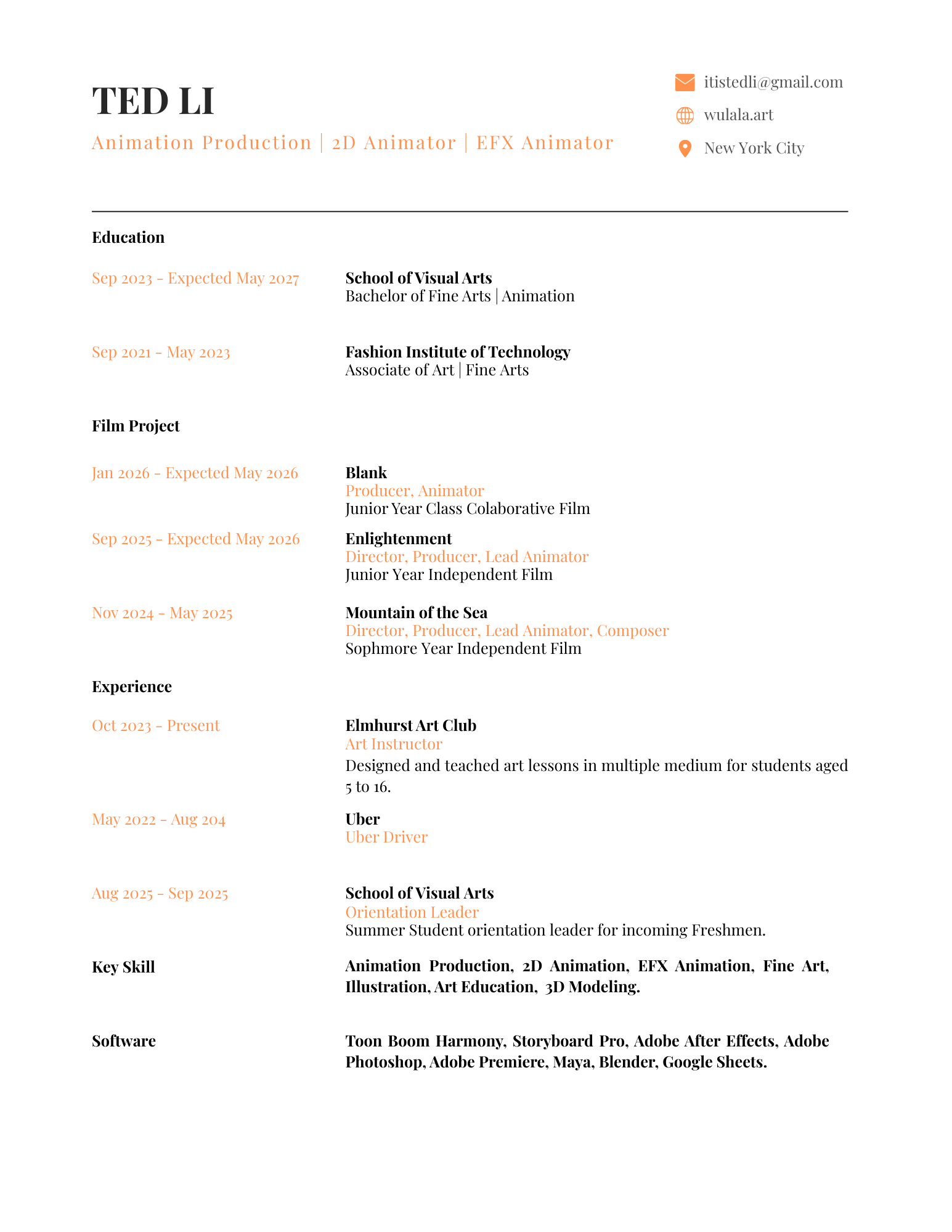 Ted Li is a New York–based animator and production professional currently studying Animation at the School of Visual Arts (SVA), with a background in Fine Arts from the Fashion Institute of Technology (FIT). He has experience producing collaborative animation projects, coordinating teams, tracking production progress, and supporting animation production pipelines.