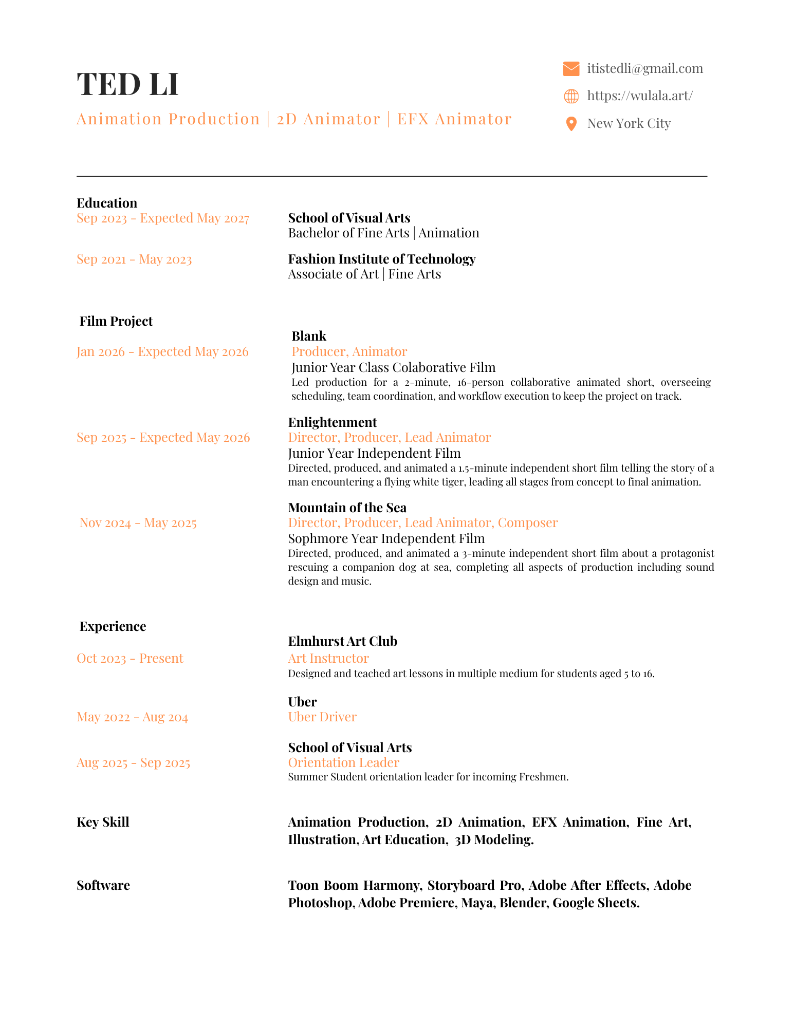 Ted Li is a New York–based animator and production professional currently studying Animation at the School of Visual Arts (SVA), with a background in Fine Arts from the Fashion Institute of Technology (FIT). He has experience producing collaborative animation projects, coordinating teams, tracking production progress, and supporting animation production pipelines.